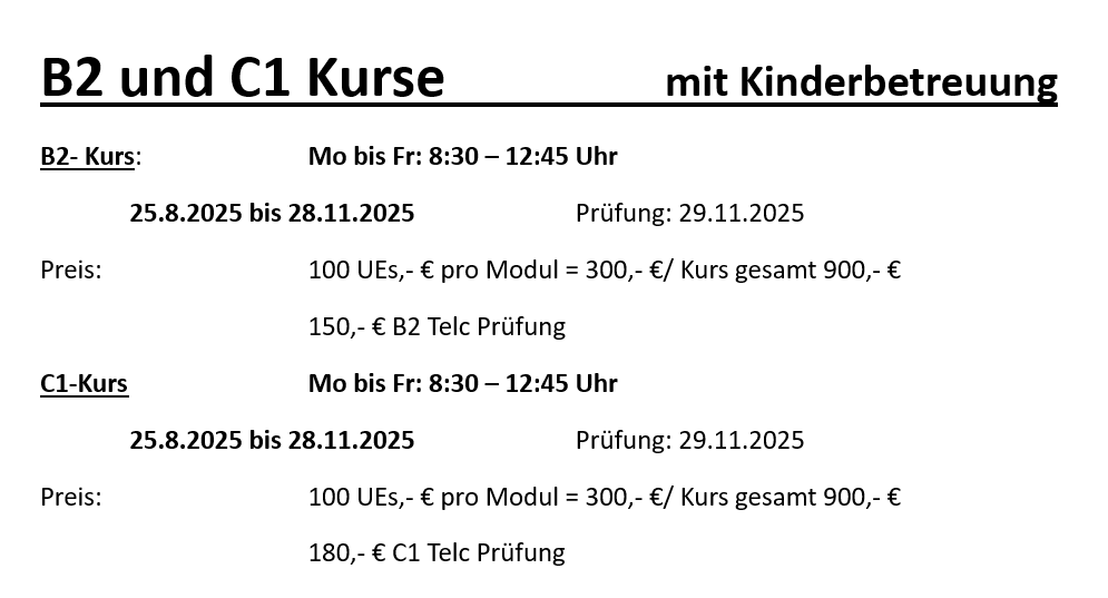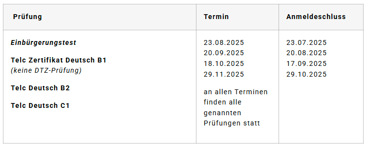 Einbürgerungstest Telc Zertifikat Deutsch B1 Telc Deutsch B2 Telc Deutsch C1 | 23.08.2025 an allen Terminen finden alle genannten Prüfungen statt | 23.07.2025 20.08.2025 17.09.2025 29.10.2025 |