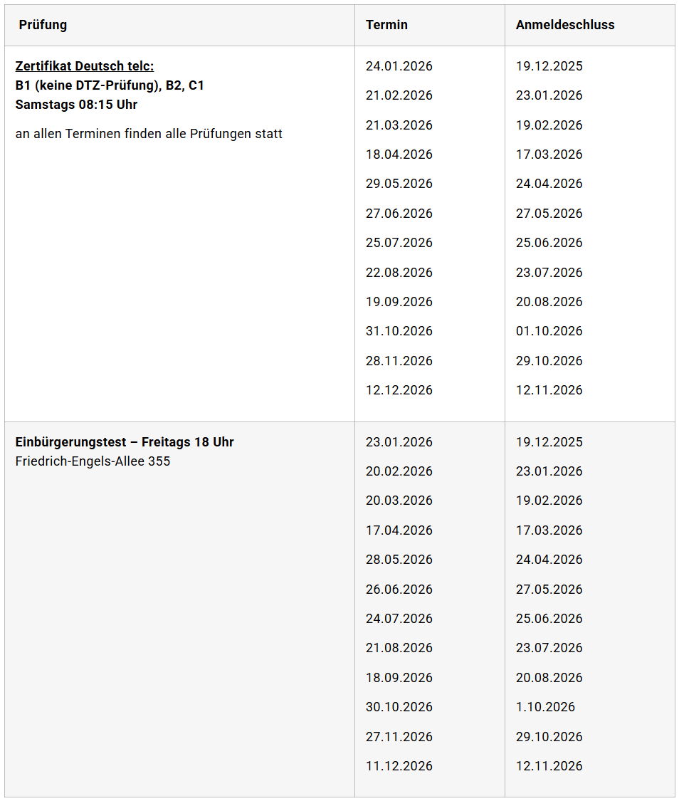 Zertifikat Deutsch telc: an allen Terminen finden alle Prüfungen statt | 24.01.2026 21.02.2026 21.03.2026 18.04.2026 29.05.2026 27.06.2026 25.07.2026 22.08.2026 19.09.2026 31.10.2026 28.11.2026 12.12.2026 | 19.12.2025 23.01.2026 19.02.2026 17.03.2026 24.04.2026 27.05.2026 25.06.2026 23.07.2026 20.08.2026 01.10.2026 29.10.2026 12.11.2026 |